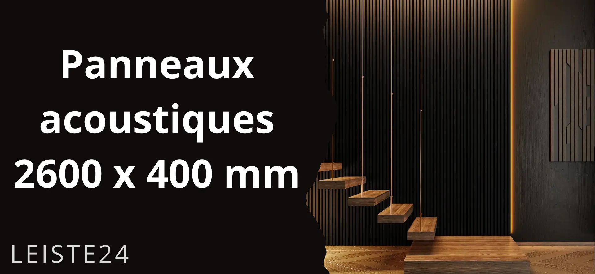 Panneau acoustique Acoustic+ 2600 x 400 mm Noir - Feutre acoustique noirPanneaux acoustiques haut de gamme dotés de la technologie CleanEdge : pas de bords visibles, un aspect lamellé moderne et une acoustique ambiante nettement amélioréeApportez plus de profondeur, de structure et de sérénité à vos pièces. Les panneaux acoustiques Acoustic+ de Leiste24 allient un aspect lamellé moderne à une isolation phonique fonctionnelle et une finition haut de gamme. Idéaux comme revêtement mural pour les pièces à vivre, les bureaux, les couloirs ou les espaces commerciaux.Technologie CleanEdge - la différence visible Lamelles entièrement recouvertes sans bords coupés apparents Un aspect soigné et haut de gamme sous tous les angles Nettement plus élégant que les panneaux acoustiques classiques aux bords MDF apparentsPourquoi choisir les panneaux acoustiques Acoustic+ de Leiste24 ? Améliorent sensiblement l'acoustique de la pièce Aspect moderne de mur à lamelles pour plus de profondeur et de structure Montage simple par collage ou vissage Finition haut de gamme pour des solutions murales durablesDétails du produit Lamelles en MDF avec revêtement décoratif de qualité en noir Dimensions : 2600 x 400 x 20 mm Feutre : noir (8 mm d'épaisseur) Matériau : MDF Dimensions des lamelles : 27 mm de largeur et 12 mm d'épaisseur Espacement entre les lamelles : 18 mm Panneaux muraux entièrement pré-assemblés Montage Le revêtement à lamelles est très rapide et facile à monter. Vous pouvez soit coller, soit visser les panneaux acoustiques au mur. Pour le plafond, nous recommandons une combinaison de collage et de vissage. La combinaison parfaite entre design et fonctionnalité pour des pièces qui ne sont pas seulement esthétiques, mais aussi plus agréables à vivre.