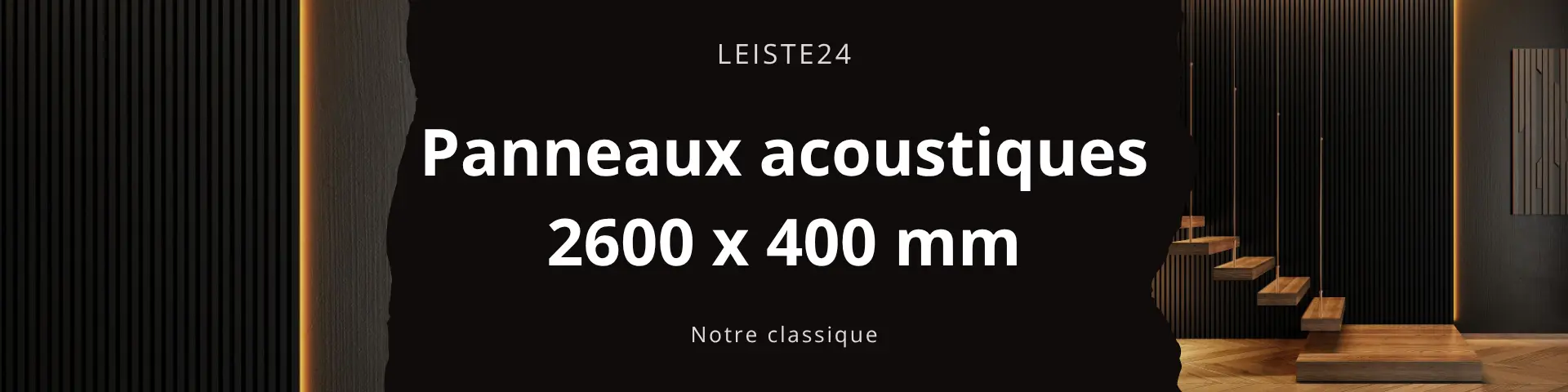 Panneau acoustique Acoustic+ 2600 x 400 mm Chêne sauvage - Feutre acoustique noirPanneaux acoustiques haut de gamme dotés de la technologie CleanEdge : pas de bords visibles, un aspect lamellé moderne et une acoustique ambiante nettement amélioréeApportez plus de profondeur, de structure et de sérénité à vos pièces. Les panneaux acoustiques Acoustic+ de Leiste24 allient un aspect lamellé moderne à une isolation acoustique fonctionnelle et une finition haut de gamme. Idéaux comme revêtement mural pour les pièces à vivre, les bureaux, les couloirs ou les espaces commerciaux.Technologie CleanEdge la différence visible Lamelles entièrement recouvertes sans bords coupés apparents Un aspect soigné et haut de gamme sous tous les angles Nettement plus élégant que les panneaux acoustiques classiques aux bords MDF apparentsPourquoi choisir les panneaux acoustiques Acoustic+ de Leiste24 ? Améliorent sensiblement l'acoustique de la pièce Aspect moderne de mur à lamelles pour plus de profondeur et de structure Montage simple par collage ou vissage Finition haut de gamme pour des solutions murales durablesDétails du produit Lamelles en MDF avec placage décoratif de qualité en chêne sauvage Dimensions : 2600 x 400 x 20 mm Feutre : noir (8 mm d'épaisseur) Matériau : MDF Dimensions des lamelles : 27 mm de largeur et 12 mm d'épaisseur Espacement entre les lamelles : 18 mm Panneaux muraux entièrement pré-assemblés Montage Le revêtement à lamelles est très rapide et facile à monter. Vous pouvez soit coller, soit visser les panneaux acoustiques au mur. Pour le plafond, nous recommandons une combinaison de collage et de vissage. La combinaison parfaite entre design et fonctionnalité pour des pièces qui ne sont pas seulement esthétiques, mais aussi plus agréables à vivre.