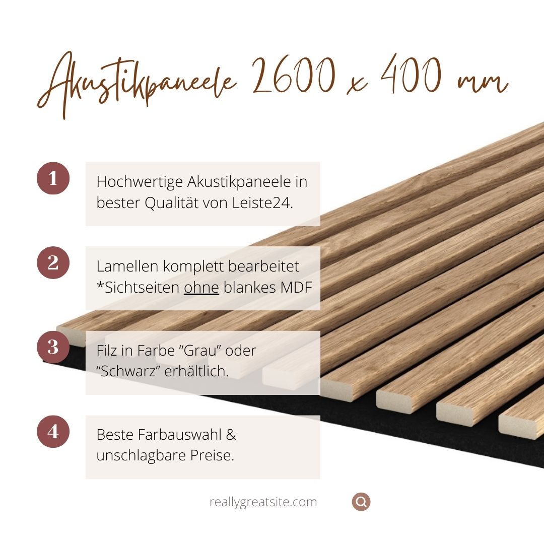Revêtement en lames - Revêtement mural - Panneau acoustique sur mesureAvec nos panneaux acoustiques sur mesure, vous bénéficiez dune combinaison parfaite entre design et fonctionnalité. Commandez vos panneaux à la longueur souhaitée et profitez dun processus de commande simple et transparent.Comment commander vos panneaux acoustiques sur mesure :Choisissez vos panneaux souhaitésAjoutez les panneaux acoustiques de votre choix au panier. Ajoutez la découpeUne découpe est nécessaire par panneau. Sélectionnez donc le nombre correspondant de découpes. Indiquez la longueur souhaitéeSaisissez la longueur requise dans le champ de commentaire de la commande.Sur demande, nous pouvons également vous fournir les sections découpées. Longueurs maximales par panneau :260 cm pour les panneaux acoustiques mesurant 2600 x 400 mm 240 cm pour les panneaux acoustiques mesurant 2400 x 600 mm 300 cm pour les panneaux acoustiques mesurant 3000 x 400 mm Pourquoi choisir les panneaux acoustiques de Leiste24 ?Finition haut de gamme :Lames de 12 mm dépaisseur avec bords entièrement revêtus.Aucun bord MDF apparent pour un rendu esthétique de haute qualité. Design exclusif :Surfaces soigneusement travaillées pour une ambiance luxueuse.Designs intemporels et élégants pour sublimer vos espaces. Large choix :Différentes couleurs, surfaces et dimensions adaptées à tous les styles dintérieur. Excellente absorption acoustique :Réduction du bruit et amélioration de lacoustique des pièces.Idéal pour les bureaux, salons ou salles de conférence. Matériaux durables :Feutre fabriqué à partir de fibres plastiques recyclées et certifiées.Une démarche respectueuse de lenvironnement et durable. Qualité premium à prix équitable :Matériaux robustes et durables offrant le meilleur rapport qualité-prix. Avec les panneaux acoustiques de Leiste24, créez une atmosphère paisible et élégante dans vos espaces.Laissez-vous convaincre par la parfaite alliance entre design et fonctionnalité !