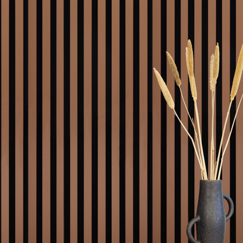 Revêtement à lamelles - Revêtement mural - Panneau acoustique 3000 x 400 mm cuivre - Feutre acoustique noirAméliorez l'acoustique de votre pièce et obtenez un effet WOWNotre revêtement mural et de plafond polyvalent est un tapis noir en feutre fixé sur des baguettes en MDF. Que ce soit à l'horizontale, à la verticale ou en diagonale, vous serez séduit par son aspect exceptionnel. Vous pouvez même poser le revêtement à lamelles au plafond. En plus de son aspect magnifique, le tapis en feutre vous permet également de réduire le bruit dans votre pièce. Les panneaux sont livrés en une seule pièce, vous pouvez donc les installer immédiatement. Lors du montage, votre créativité n'a pas de limites. Aperçu des données :Panneaux acoustiques - mur lamellaire comme revêtement mural et de plafondDimensions : 3000 mm x 400 mm x 20 mmTapis en feutre noir, épaisseur 8 mmLamelles en MDF avec revêtement décoratif de qualitéDimensions des lamelles : 27 mm de largeur et 12 mm d'épaisseur Distance entre les lamelles : 18 mmPanneaux muraux entièrement prémontés Le montageLe revêtement à lamelles est très rapide et facile à monter. Vous pouvez soit coller ou visser le revêtement à lamelles au mur. Pour le collage, il suffit d'appliquer la colle au dos des panneaux muraux et de les placer à l'endroit souhaité. Vous pouvez également visser les panneaux acoustiques au mur. Pour le plafond, nous recommandons de combiner le collage et le vissage. Pourquoi choisir les panneaux acoustiques de Leiste24 ?Nos panneaux acoustiques vous offrent le meilleur des deux mondes : une qualité exceptionnelle et un rapport qualité-prix imbattable. Alliant style et fonctionnalité, ils constituent le choix idéal pour les aménagements intérieurs exigeants.Finition de première classe : nos panneaux sont composés de lamelles de 12 mm d'épaisseur qui sont entièrement recouvertes. Il n'y a pas de bords MDF ouverts, ce qui garantit un aspect durable et de haute qualité, jusque dans les moindres détails.Design exclusif : chaque surface de nos panneaux est soigneusement finie pour créer une ambiance luxueuse et agréable. Rehaussez vos pièces avec des designs intemporels et élégants qui ne sont pas seulement esthétiques, mais optimisent également l'acoustique.Un choix varié : que vous ayez un intérieur moderne, minimaliste ou classique, nous proposons un large choix de couleurs, de surfaces et de dimensions afin de trouver la solution parfaite pour chaque pièce.Excellente absorption acoustique : outre leur aspect esthétique, nos panneaux acoustiques offrent une excellente absorption acoustique. Ils garantissent le calme et améliorent l'acoustique dans toutes les pièces, que ce soit au bureau, dans le salon ou dans la salle de conférence.Matériaux durables : nos panneaux sont non seulement de haute qualité, mais aussi respectueux de l'environnement. Le feutre utilisé est composé de matériaux certifiés et durables contenant des fibres plastiques recyclées, ce qui est parfait pour un aménagement intérieur respectueux de l'environnement.Des matériaux de haute qualité à un prix équitable : chez Leiste24, vous n'avez pas à faire de compromis. Vous bénéficiez d'une qualité irréprochable à un prix équitable. Nos panneaux acoustiques sont fabriqués à partir de matériaux durables et de haute qualité qui sont imbattables sur le marché.Avec les panneaux acoustiques de Leiste24, vous créez non seulement une ambiance calme, mais aussi élégante. Découvrez par vous-même la combinaison parfaite entre design et fonctionnalité à un prix avantageux !