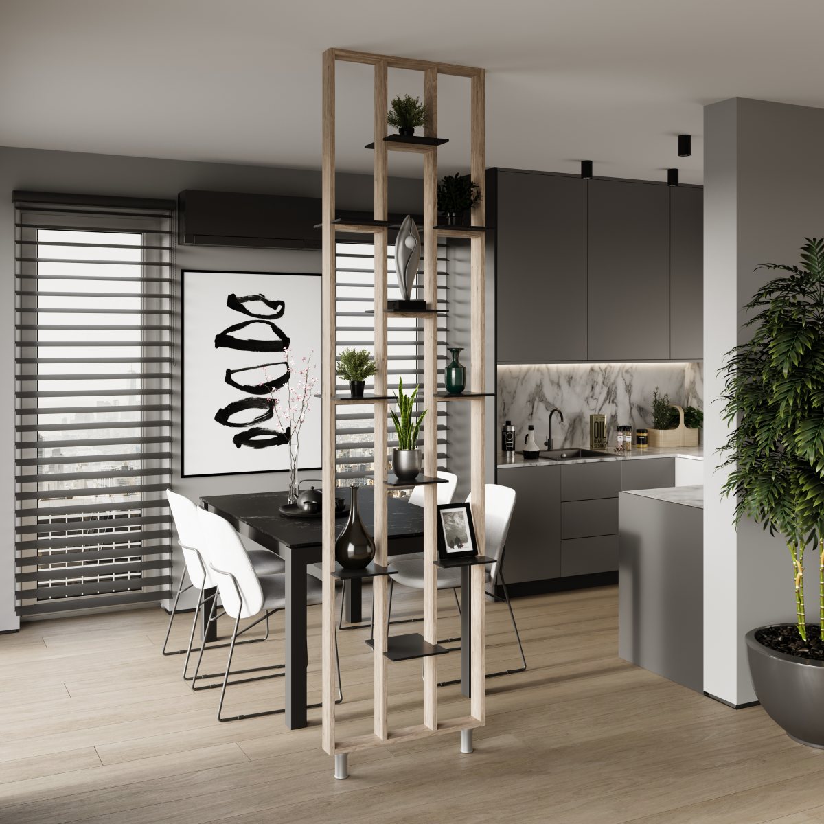 Le séparateur de pièce design en couleurs modernes combine un système détagères élégant avec une fonction de cloisonnement pratique. Son design épuré et minimaliste sintègre parfaitement dans les espaces de vie et de travail modernes et crée une structure élégante sans réduire visuellement lespace.