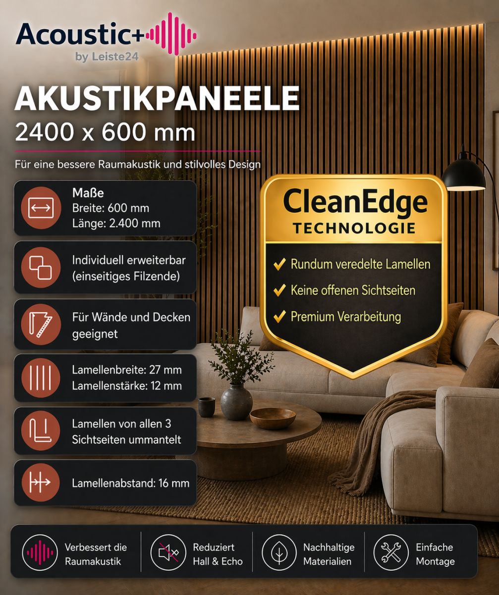 Apportez plus de profondeur, de structure et de sérénité à vos pièces. Les panneaux acoustiques Acoustic+ de Leiste24 allient un aspect lamellé moderne à une isolation acoustique fonctionnelle et une finition haut de gamme. Idéaux comme revêtement mural pour les pièces à vivre, les bureaux, les couloirs ou les espaces commerciaux.