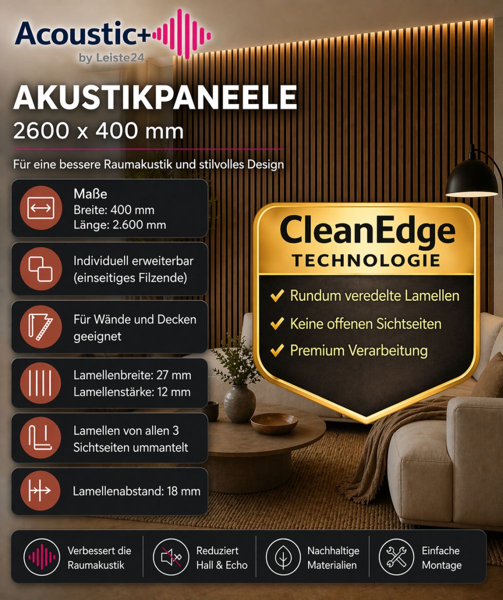Apportez plus de profondeur, de structure et de sérénité à vos pièces. Les panneaux acoustiques Acoustic+ de Leiste24 allient un aspect lamellé moderne à une isolation phonique fonctionnelle et une finition haut de gamme. Idéaux comme revêtement mural pour les pièces à vivre, les bureaux, les couloirs ou les espaces commerciaux.