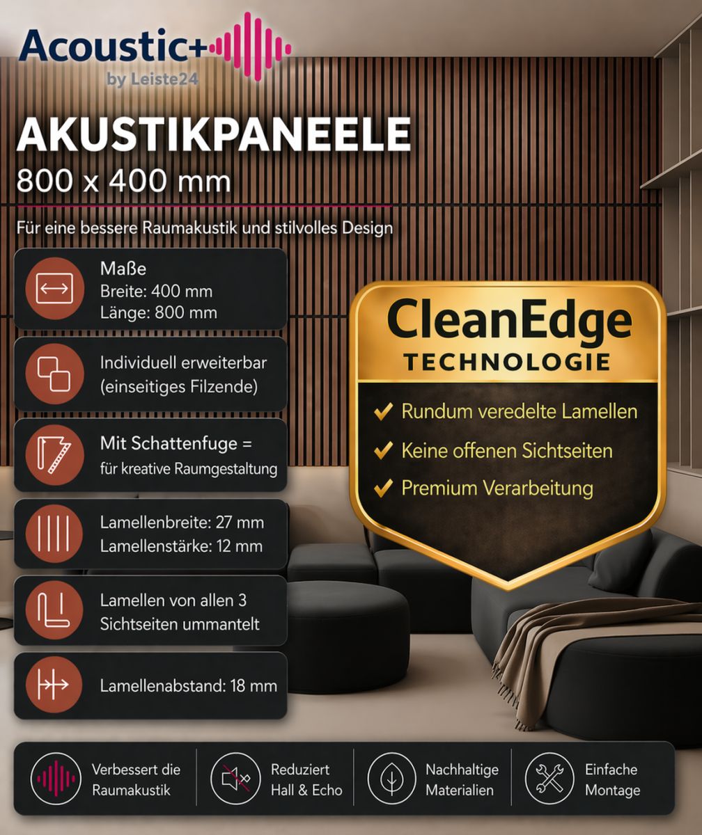 Panneau acoustique Acoustic+ 800 x 400 mm Noir - Feutre acoustique noirPanneaux acoustiques haut de gamme dotés de la technologie CleanEdge : pas de bords visibles, un aspect lamellé moderne et une acoustique ambiante nettement amélioréeApportez plus de profondeur, de structure et de sérénité à vos pièces. Les panneaux acoustiques Acoustic+ de Leiste24 allient un aspect lamellé moderne à une isolation acoustique fonctionnelle et une finition haut de gamme. Idéaux comme revêtement mural haut de gamme pour les pièces à vivre, les couloirs ou des surfaces design ciblées.Technologie CleanEdge - la différence visible Lames entièrement recouvertes sans bords coupés apparents Un aspect soigné et haut de gamme sous tous les angles Nettement plus élégant que les panneaux acoustiques classiques aux bords MDF apparentsPourquoi choisir les panneaux acoustiques Acoustic+ de Leiste24 ? Améliorent sensiblement l'acoustique de la pièce Aspect moderne de mur à lamelles pour plus de profondeur et de structure Montage simple par collage ou vissage Finition haut de gamme pour des solutions murales durablesDétails du produit Lamelles en MDF avec revêtement décoratif de qualité en noir Dimensions : 800 x 400 x 20 mm Feutre : noir (8 mm d'épaisseur) Matériau : MDF Dimensions des lamelles : 27 mm de largeur et 12 mm d'épaisseur Espacement entre les lamelles : 18 mm Panneaux muraux entièrement pré-assemblés Montage Le revêtement à lamelles est très rapide et facile à monter. Vous pouvez soit coller, soit visser les panneaux acoustiques au mur. Pour le plafond, nous recommandons une combinaison de collage et de vissage. La combinaison parfaite entre design et fonctionnalité pour des pièces qui ne sont pas seulement esthétiques, mais aussi plus agréables à vivre.