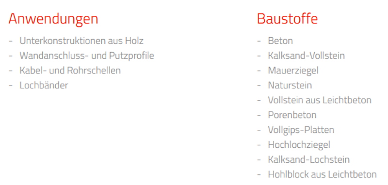 Geeignet für Beton und Vollsteine, Hohlblocksteine und Porenbeton. Ausserdem kann er zur Befestigung von Dachlatten, Metallleisten, Rahmen und Pfosten auf Beton und Mauerwerk eingesetzt werden. Zur schnellen Befestigung kann der Nageldübel auch einfach mit einem Hammer eingeschlagen werden.