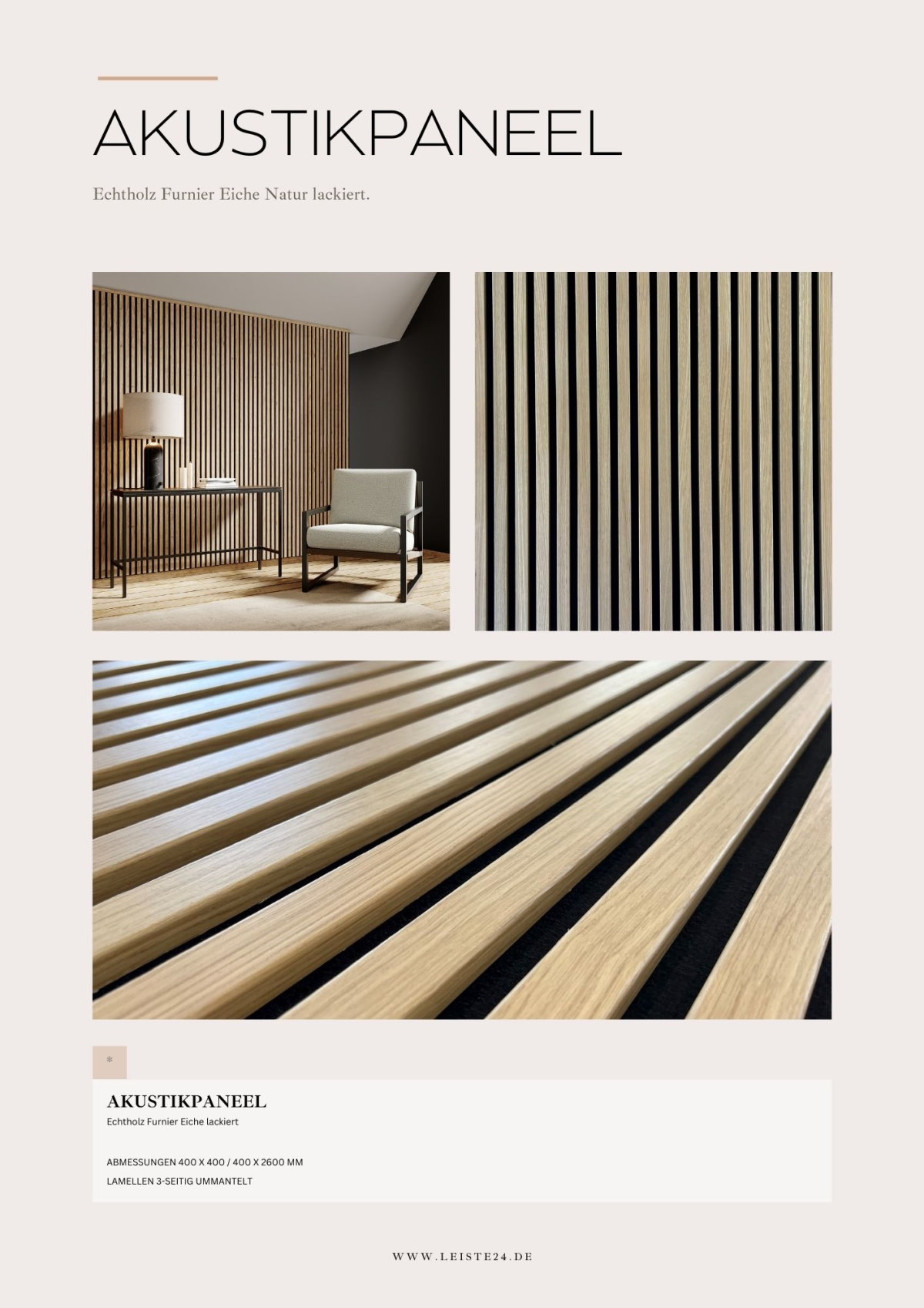Verleihen Sie Ihren Räumen mehr Tiefe, Struktur und Ruhe. Die Acoustic+ Akustikpaneele von Leiste24 verbinden moderne Lamellenoptik mit funktionaler Schalldämmung und hochwertiger Verarbeitung. Ideal als Wandverkleidung für Wohnräume, Büros, Flure oder gewerbliche Bereiche.