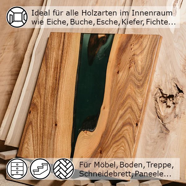 Die Vorbereitung: Holzoberfläche sorgfältig schleifen, mit grobem Schliff beginnen, Endschliff für Möbel P180-240, für Böden P100-150. Holzfeuchte: 812%. Die Fläche muss trocken, gründlich gereinigt und frei von Öl, Wachs, Fett, Silikon und Schleifstaub sein. Material bei Raumtemperatur verarbeiten und gut schütteln/aufrühren.
