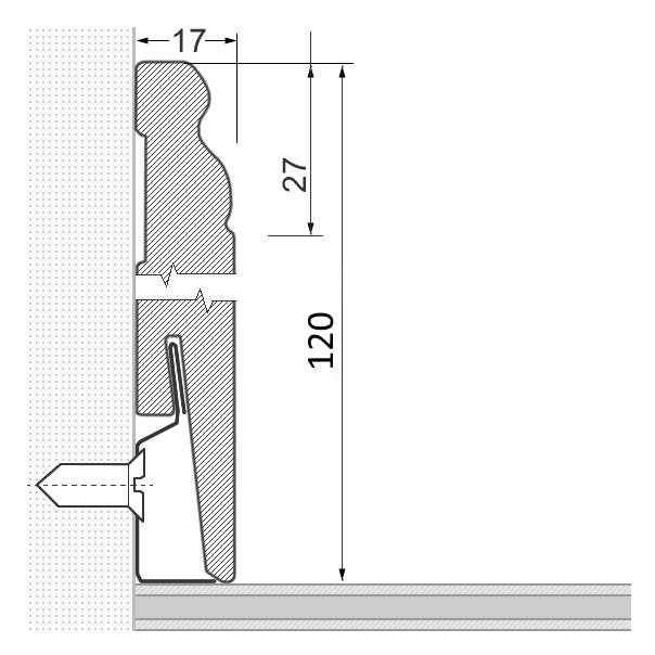 - Deckabmessung mit Clipmontage: 120 x 17 x 2.400 mm