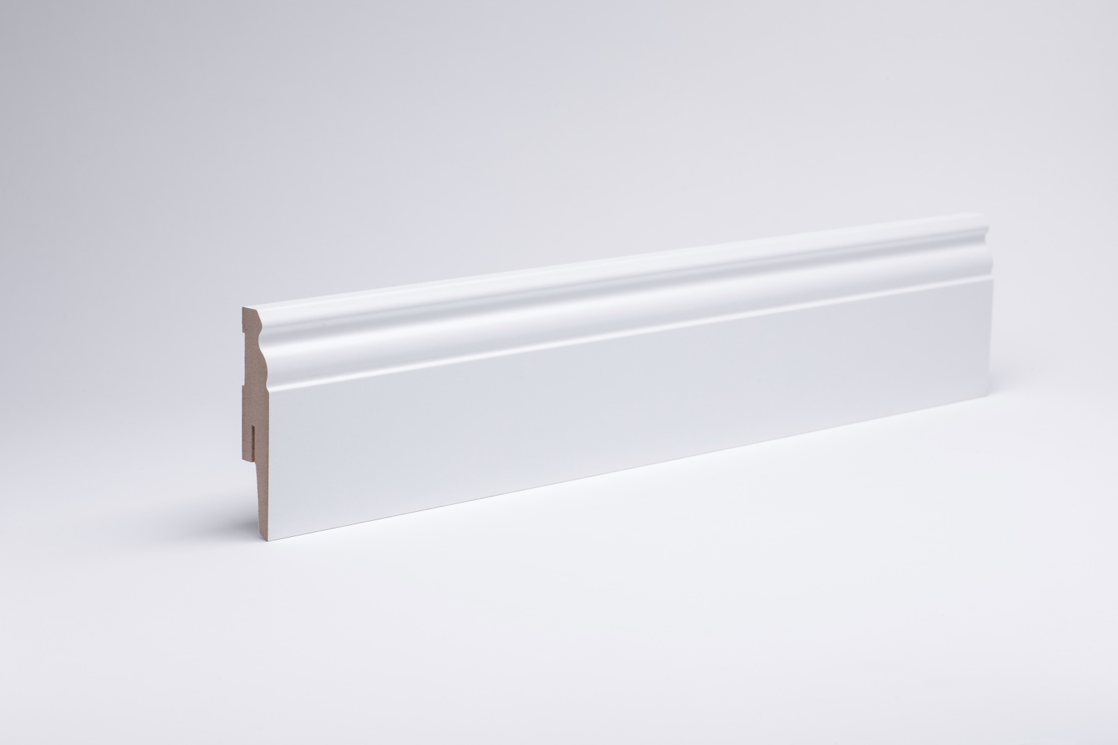 Unsere weiße Sockelleiste mit edlem Berliner Profil, auch als Hamburger Profil bekannt, verschönert durch ihren klassischen und zeitlosen Stil jeden Raum.