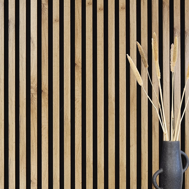 Muster WAVE - Lamellenverkleidung - Wandverkleidung - Akustikpaneel Eiche natur - Akustikfilz Schwarz ACHTUNG! Sie erhalten ein MUSTER mit 3 Lamellen auf Akustikfilz. Verbessern Sie die Akustik Ihres Raumes und bekommen sie den WOW-Effekt Unsere universell einsetzbare Wandverkleidung ist eine schwarze Matte aus Filz, auf dem MDF Leisten angebracht sind. Egal ob horizontal, vertikal oder diagonal, Sie werden von der außergewöhnlichen Optik begeistert sein. Sogar an der Decke können Sie die Lamellenverkleidung anbringen. Zusätzlich zur großartigen Optik können Sie durch die Filzmatte auch den Schall in Ihrem Raum verringern. Die Paneele erhalten Sie in einem Stück, sodass Sie diese sofort montieren können. Bei der Montage sind Ihrer Kreativität keine Grenzen gesetzt. Daten im Überblick: Filzmatte in Schwarz 8mm stark Lamellen aus MDF mit Qualitäts-Dekorkaschierung in Eiche natur komplett vormontiert Die Montage Die Lamellenverkleidung ist sehr schnell und einfach zu montieren. Entweder Sie Schrauben oder Kleben die Lamellenverkleidung an die Wand. Sie können die Paneele nach genauer Platzierung mit einfachen Schrauben an der Wand fixieren. Alternativ können Sie die Platten auch mit Montagekleber befestigen. Für die Decke empfehlen wir Schrauben und Kleben in Kombination.