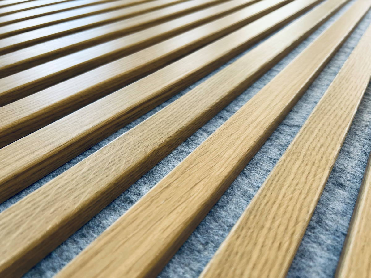Muster für Massivholz Akustikpaneel 130 x 100 mm Eiche natur SAFRAN Red - Akustikfilz Schwarz ACHTUNG! Sie erhalten ein MUSTER mit 3 Lamellen auf Akustikfilz ca 130 x 100 mm. Verbessern Sie die Akustik Ihres Raumes und bekommen sie den WOW-Effekt Unsere universell einsetzbare Wandverkleidung ist eine schwarze Matte aus Filz, auf dem Massivholzleisten aus Eiche angebracht sind. Egal ob horizontal, vertikal oder diagonal, Sie werden von der außergewöhnlichen Optik begeistert sein. Sogar an der Decke können Sie die Lamellenverkleidung anbringen. Zusätzlich zur großartigen Optik können Sie durch die Filzmatte auch den Schall in Ihrem Raum verringern. Die Paneele erhalten Sie in einem Stück, sodass Sie diese sofort montieren können. Bei der Montage sind Ihrer Kreativität keine Grenzen gesetzt. Daten im Überblick: Maße: ca. 130mm x 100 mm x 20 mm Filzmatte in Schwarz 8mm stark 12mm starke Lamellen aus Massivholz Eiche Abstände zwischen den Lamellen 18mm komplett vormontiert