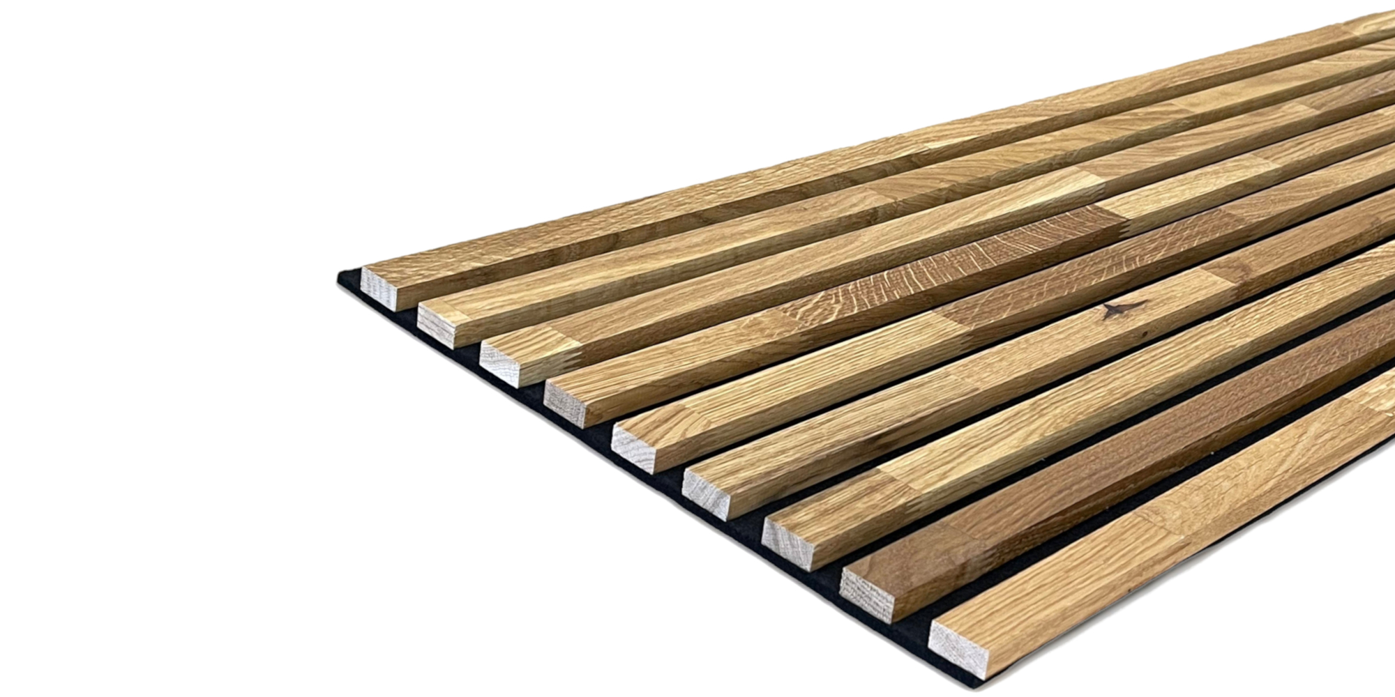 Lamellenverkleidung - Wandverkleidung - Massivholz Akustikpaneel 2400 x 600 mm Eiche natur geölt - Akustikfilz Schwarz Verbessern Sie die Akustik Ihres Raumes und bekommen sie den WOW-Effekt Unsere universell einsetzbare Wand- und Deckenverkleidung ist eine Schwarze Matte aus Filz, auf dem Eiche Massivholzlamellen angebracht sind. Durch die keilgezinkten Eiche Massivholzlamellen entsteht ein natürliches und eine einzigartiges Oberflächenbild. Egal ob horizontal, vertikal oder diagonal, Sie werden von der außergewöhnlichen Optik begeistert sein. Sogar an der Decke können Sie die Lamellenverkleidung anbringen. Zusätzlich zur großartigen Optik können Sie durch die Filzmatte auch den Schall in Ihrem Raum verringern. Die Paneele erhalten Sie in einem Stück, sodass Sie diese sofort montieren können. Bei der Montage sind Ihrer Kreativität keine Grenzen gesetzt. Oberflächenbehandlung: Unsere Eiche Massivholzlamellen werden mit einem natürlichen Holzöl behandelt. Ein schützendes und tiefwirkendes Imprägnieröl auf Basis von Naturölen. Es verleiht dem Holz ein farbvertiefendes Aussehen und die Maserung tritt wunderschön hervor. Daten im Überblick: Massivholzpaneele - Lamellenwand als Wand- und Deckenverkleidung Maße: 2400 mm x 600 mm x 20 mm Filzmatte in Schwarz 8 mm stark Lamellen aus keilgezinkten Eiche Massivholzlamellen Oberfläche Eiche geölt Maße der Lamellen 27 mm breit und 12 mm stark Abstände zwischen den Lamellen 18 mm Wandpaneele komplett vormontiert Die Montage Die Lamellenverkleidung ist sehr schnell und einfach zu montieren. Entweder sie Kleben oder Schrauben die Lamellenverkleidung an die Wand. Beim Kleben geben sie einfach den Kleber auf die Rückseite der Wandpaneele und platzieren diese dann an die gewünschte Stelle. Alternativ können sie die Akustikpaneele auch an der Wand verschrauben. Für die Decke empfehlen wir Kleben und Schrauben in Kombination. Warum Akustikpaneele von Leiste24? Massivholz Akustikpaneele aus Eiche Natur von Leiste24 bieten eine perfekte Kombination aus natürlicher Ästhetik, hervorragender Akustik und nachhaltiger Qualität. Hier sind die wichtigsten Gründe, warum Sie sich für unsere Massivholz-Paneele entscheiden sollten: Hochwertige Verarbeitung: Unsere Paneele bestehen aus massiven Eichenholzlamellen, die durch ihre robuste und natürliche Beschaffenheit überzeugen. Sie bieten sie eine unvergleichliche Langlebigkeit und eine edle, authentische Optik, die den Charme echten Holzes widerspiegelt. Exklusives Design mit natürlicher Ästhetik: Jede Oberfläche wird sorgfältig behandelt, um die natürliche Schönheit der Eiche zu betonen. Dank verschiedener Oberflächenbehandlungen sowie der Möglichkeit, die Paneele mit Farbölen oder Naturölen zu veredeln, entsteht ein luxuriöses und einladendes Ambiente, das zeitlos und elegant ist. Große Auswahl an Farben und Oberflächen: Unsere Massivholz-Akustikpaneele bieten eine breite Palette an Farboptionen, die durch verschiedene Behandlungen und Ölungen erzielt werden. Ob Sie einen helleren, natürlichen Eichen-Look bevorzugen oder eine dunklere, warme Farbvariante - die Vielfalt ermöglicht es Ihnen, die perfekte Lösung für Ihre Einrichtung zu finden. Optimale Schallabsorption: Die Akustikpaneele aus Eichenholz bieten nicht nur eine edle Optik, sondern auch eine ausgezeichnete Schallabsorption. Sie sorgen für eine angenehme und ruhige Atmosphäre, egal ob im Büro, Wohnzimmer oder Konferenzraum. Lärm wird effektiv reduziert, sodass eine bessere Akustik für Gespräche und Entspannung entsteht. Nachhaltige Materialien: Unsere Paneele bestehen nicht nur aus hochwertigem Eichenholz, sondern integrieren auch umweltfreundliche Materialien wie Filz aus zertifizierten und nachhaltigen Kunststofffasern mit einem recycelten Anteil. Diese Kombination macht unsere Akustikpaneele zur idealen Wahl für umweltbewusste Projekte und nachhaltige Raumgestaltungen. Massive Qualität zu einem fairen Preis: Bei Leiste24 müssen Sie keine Kompromisse eingehen. Unsere Massivholz-Akustikpaneele aus Eiche überzeugen durch herausragende Qualität, natürliche Materialien und eine Verarbeitung, die im Marktvergleich unschlagbar ist - und das zu einem Preis, der sich lohnt. Mit unseren Massivholz Akustikpaneelen Eiche Natur schaffen Sie eine harmonische Verbindung aus Design, Funktionalität und Nachhaltigkeit. Erleben Sie die natürliche Schönheit und die beruhigende Wirkung von echtem Holz, kombiniert mit nachhaltigen Materialien, die Ihre Räume nicht nur optisch aufwerten, sondern auch akustisch optimieren. Entscheiden Sie sich für Leiste24 und verwandeln Sie Ihre Räume in ein stilvolles, ruhiges und umweltbewusstes Ambiente!