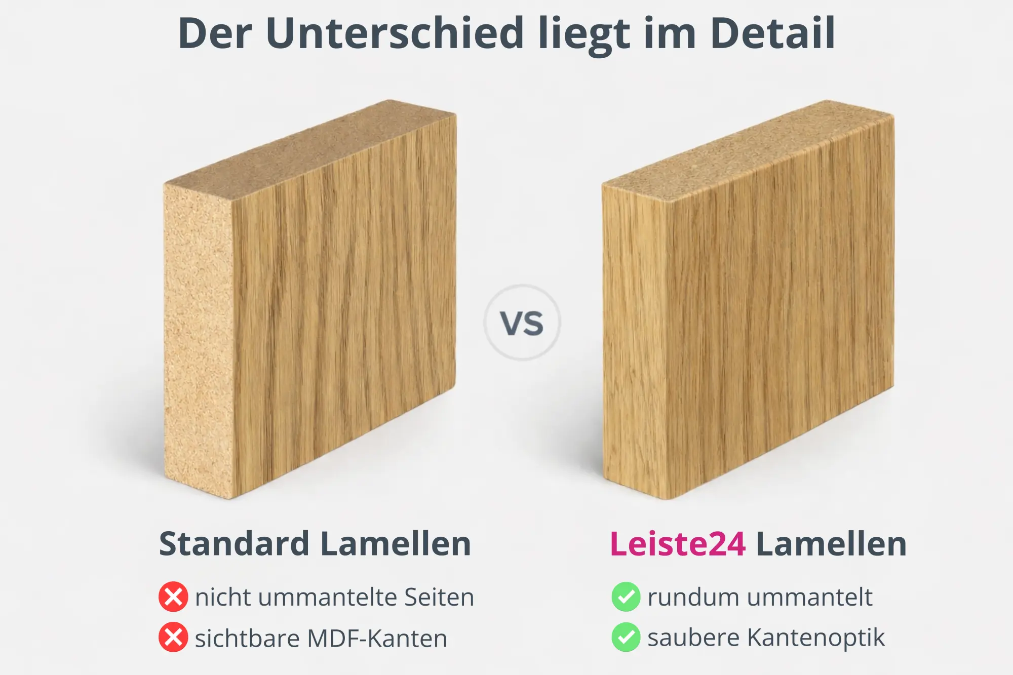 Ein entscheidender Qualitätsvorteil liegt in den rundum ummantelten Sichtseiten. Im Gegensatz zu vielen Standardlösungen sind unsere Lamellen nicht nur von vorne, sondern auch an den sichtbaren Seiten hochwertig verarbeitet. Das sorgt für ein deutlich saubereres, harmonischeres Gesamtbild und eine besonders wertige Optik.