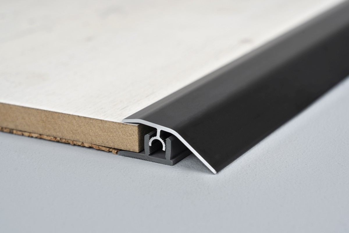 Die Montage ist besonders schnell und einfach. Mit dem bogenverzahnten Gelenksteg rastet das Oberprofil im Basisprofil ein und passt sich automatisch dem Bodenbelag an - variabel in Höhe und Neigung. Auch bei starken Niveauunterschieden liegt das Profil an beiden Seiten dicht an.