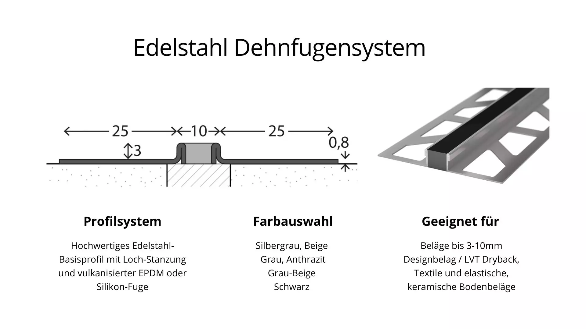 Gefertigt aus hochwertigen Materialien wie Aluminium, Edelstahl oder flexiblem Kunststoff, sind unsere Dehnungsfugenprofile ideal für den Einsatz in Wohnräumen, Büros, industriellen Umgebungen und Außenbereichen. Die Materialien bieten eine hohe Beständigkeit gegen Belastung, Feuchtigkeit und Temperaturschwankungen und passen sich optimal an die Gegebenheiten vor Ort an.