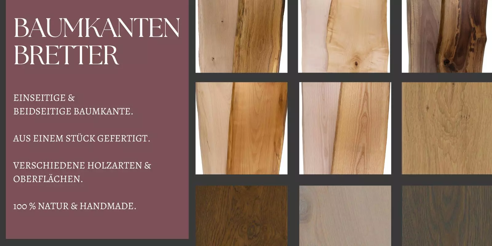 Unsere Baumkantenbretter sind in verschiedenen edlen Holzarten wie Eiche, Esche, Ahorn, Nussbaum und Kirschbaum erhältlich. Durch ihre einzigartige Maserung und Struktur wird jedes Brett zu einem unverwechselbaren Unikat. Mit unterschiedlichen Stärken und Längen bieten wir Ihnen die Flexibilität, die Sie für Ihre individuellen Projekte benötigen.