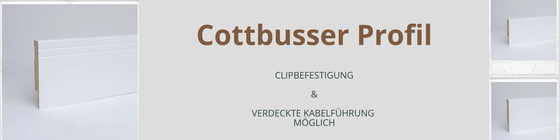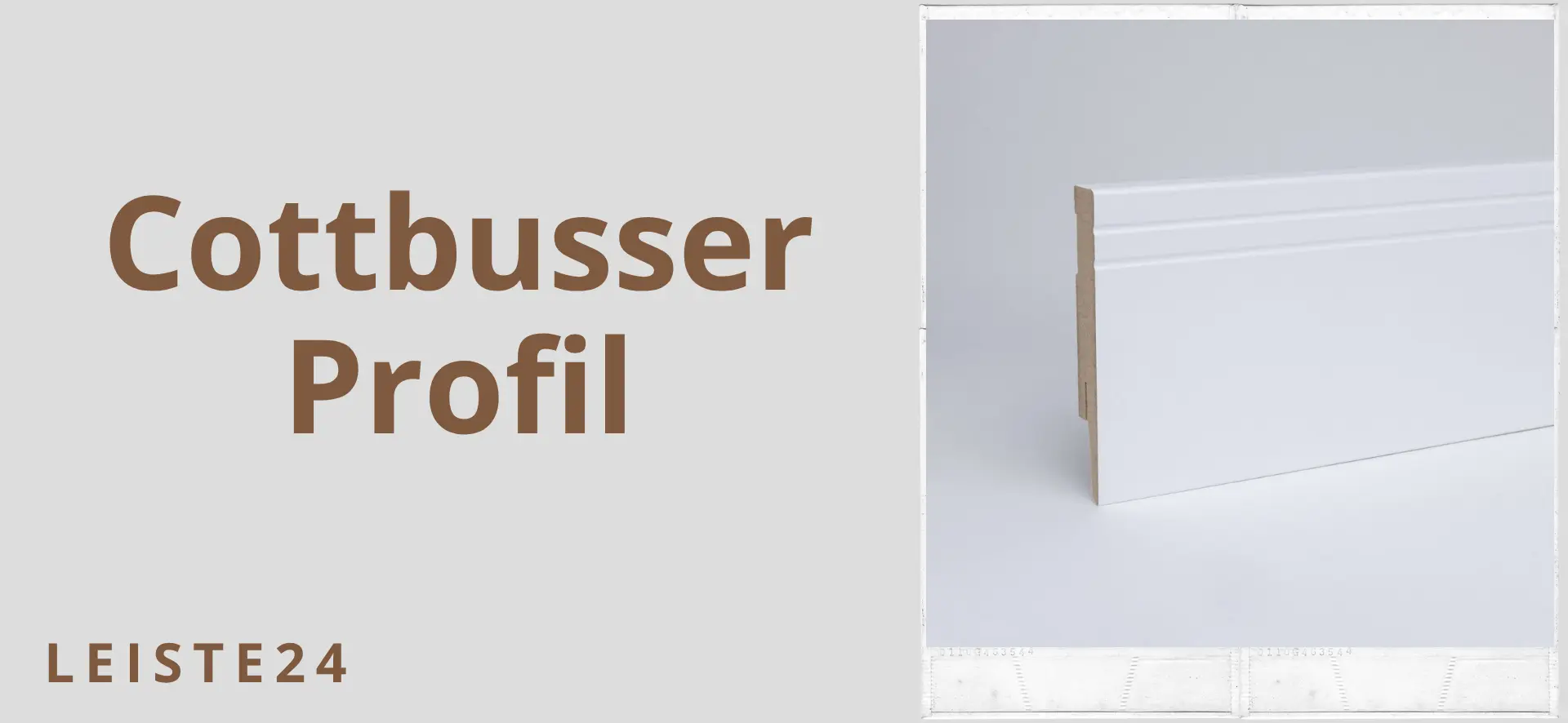 Moderne Fuß- und Sockelleisten günstig online bestellen mit den MDF-Sockelleisten Cottbusser Profil in Weiß von leiste24. Die hochwertigen Leisten mit Cottbusser Profil sind in den Höhen 80, 100, 120 und 150mm erhältlich und überzeugen durch passgenaue Fertigung sowie eine moderne Optik. Der integrierte Kabelkanal ermöglicht zudem das versteckte Verlegen von Kabeln aller Art zwischen Wand und Sockelleiste.