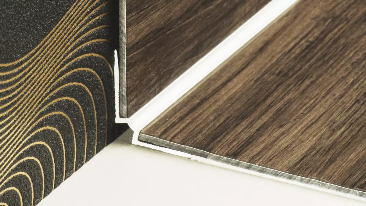 Treppenkanten für Designbeläge bis 3 mm, für die vollflächige Verlegung von Designbelägen auf Treppenstufen. Die darauf abgestimmten Innenwinkel schützen die Kanten des Belags auch in der Innenecke zwischen Tritt- und Setzstufe.