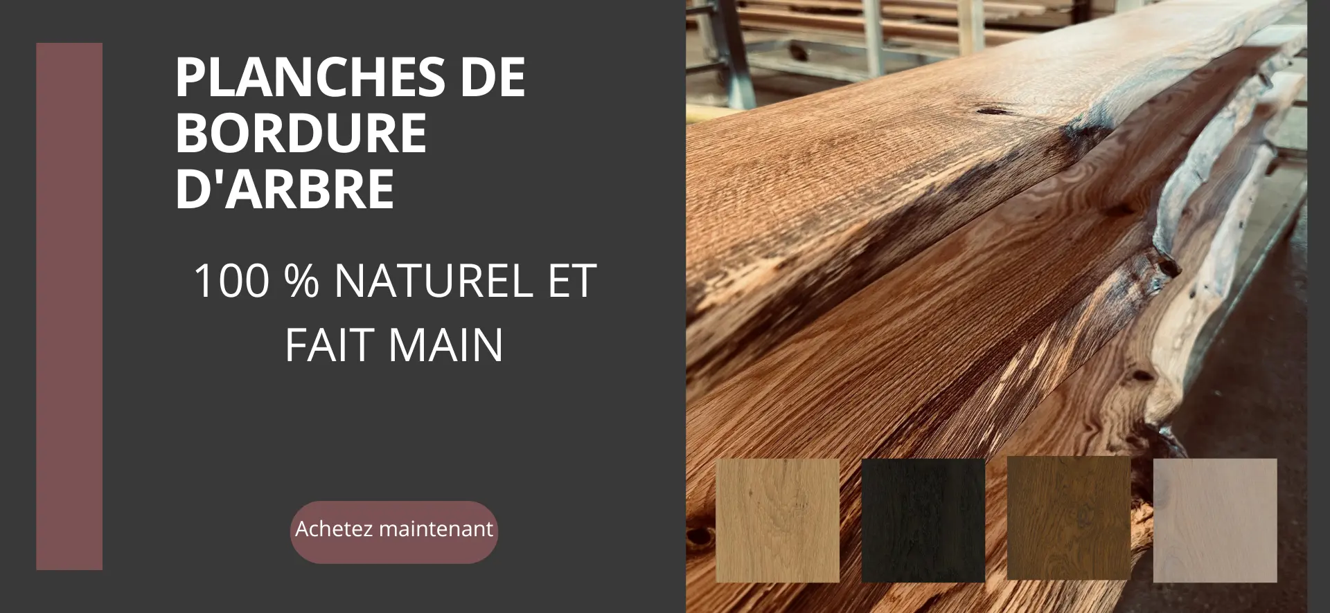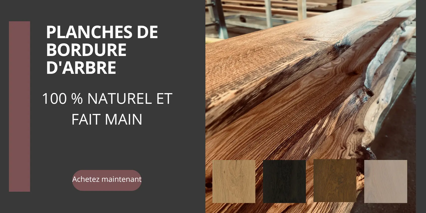 Découvrez notre sélection variée de planches à bordure d'arbre sur un côté, disponibles en différentes essences telles que le chêne, le noyer américain, le frêne, le hêtre, le pin, le cerisier et l'érable. Chaque planche présente la texture naturelle et unique du bois, idéale pour les meubles sur mesure ou les projets de décoration qui exigent une touche de naturel et de robustesse. Nos planches avec bordure d'arbre sont disponibles en différentes largeurs et longueurs et offrent de nombreuses possibilités d'utilisation grâce à leur bordure d'arbre sur un côté.