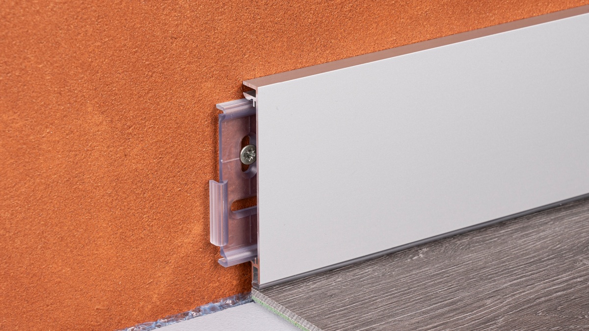 Plinthes en aluminium pour une transition élégante et attirant entre le mur et le plancher. Le canal de clip intégré permet la pose de câbles invisible derrière les plinthes .