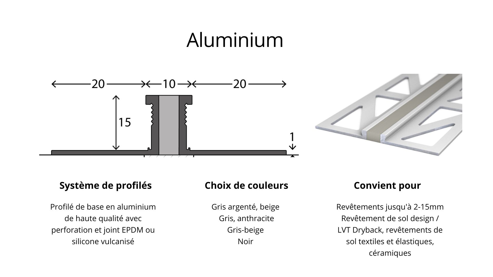 Profilé de joint de dilatation en aluminium - avec joint EPDM - pour revêtements de 10mm - Gris 2,50mLes profilés pour joints de dilatation sont idéaux pour une utilisation sur les joints de chape ou partout où la tension dans le sol doit être compensée. Grâce au joint souple au milieu du profilé, les charges de compression et de traction sont compensées sans problème. Le profilé de joint de dilatation particulièrement résistant dispose d'un joint qui s'adapte discrètement à l'aspect régulier du joint.Les données en brefProfilé pour joint de dilatation en aluminium.Joint EPDM, vulcaniséCouleur du joint : grisConvient pour des revêtements de 10mmLongueur : 2.500 mmHauteur x largeur : 11 x 50 mmConvient pour : Revêtement de sol design / LVT Dryback, Revêtements de sol textiles et élastiques Domaine d'application :Le profilé de joint de dilatation est utilisé pour tous les revêtements de sol afin de ponter les joints de dilatation et de mouvement de construction. Le profilé est placé de telle sorte qu'il se trouve exactement au-dessus du joint dans le support, afin que le joint de sol puisse continuer à bouger.Montage :Collage: Utilisez une colle à deux composants ou à base de résine de coulée ou une colle avec un pouvoir adhésif particulièrement élevé. Après avoir collé le profilé, retirez l'excédent de colle de manière lisse. Respectez les instructions du fabricant. Veillez impérativement à ce que la colle ne pénètre pas dans le joint de sol.Encastrement: Vous pouvez également encastrer le profilé à l'aide de mastics appropriés. Veillez à toujours choisir le profilé de manière à ce que la hauteur du profilé corresponde au revêtement de sol plus le mastic. Après le durcissement de la colle, le revêtement de sol peut être découpé pour s'adapter au profil. Nous recommandons d'utiliser ce profilé uniquement en combinaison avec des revêtements de sol collés.