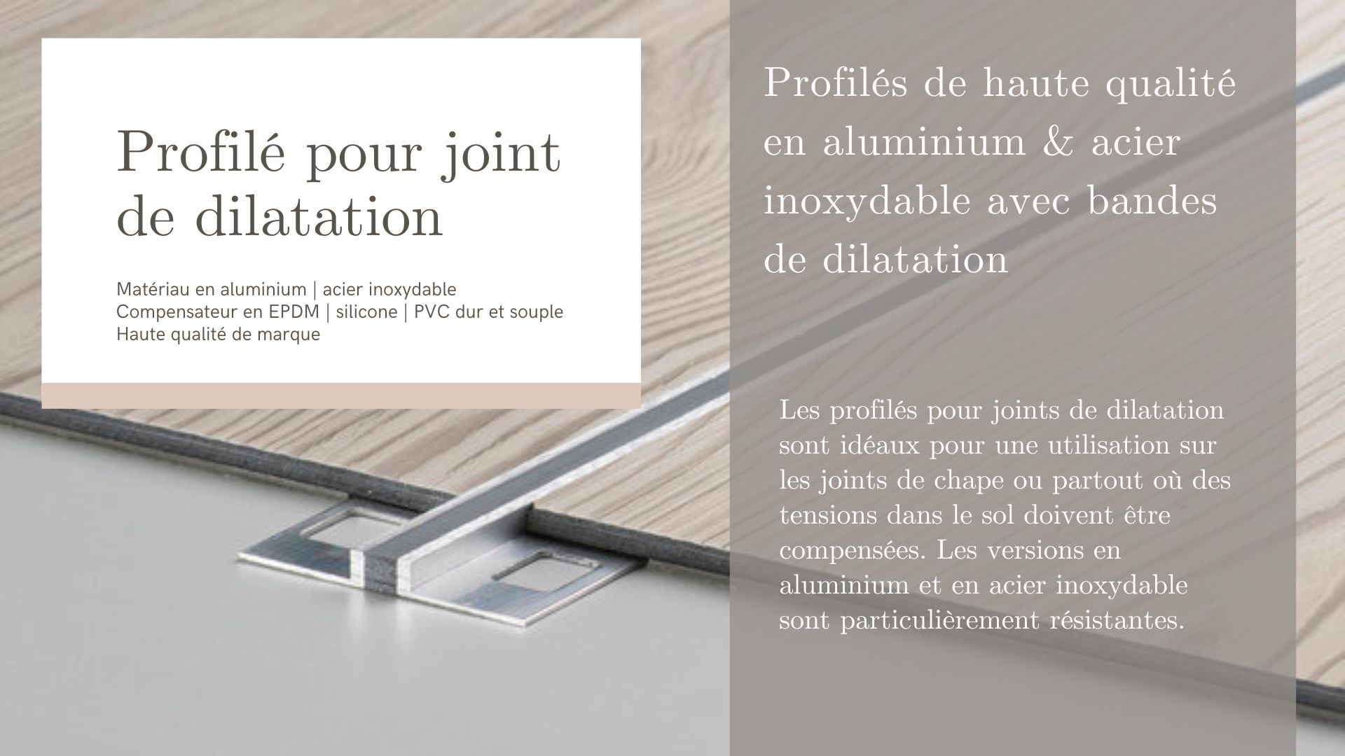 Fabriqués à partir de matériaux de haute qualité tels que l'aluminium, l'acier inoxydable ou le plastique flexible, nos profilés pour joints de dilatation sont idéaux pour une utilisation dans les habitations, les bureaux, les environnements industriels et les espaces extérieurs. Les matériaux offrent une grande résistance à la charge, à l'humidité et aux variations de température et s'adaptent parfaitement aux conditions sur place.
