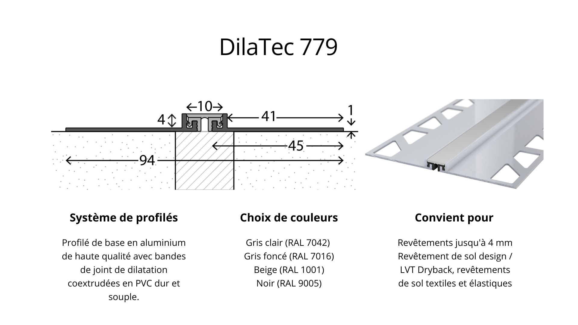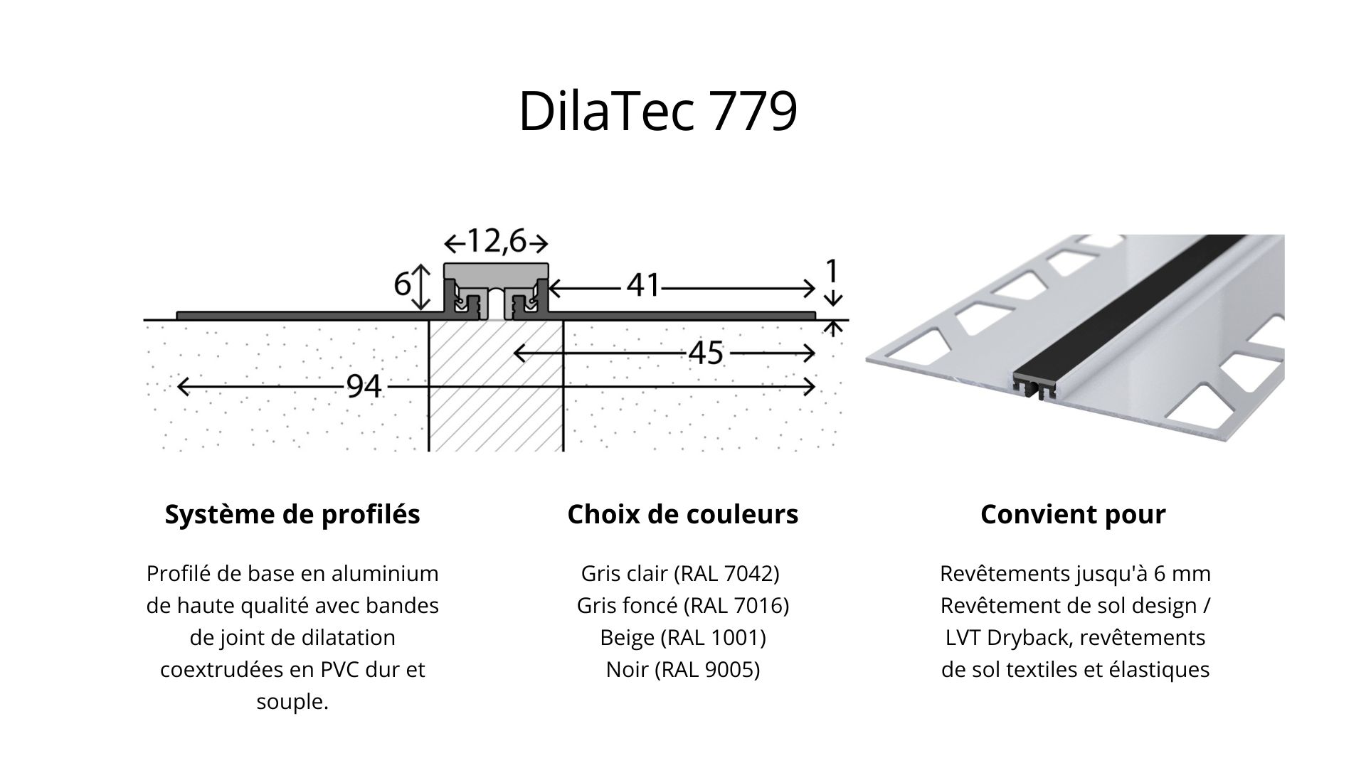 Système de joint de dilatation DilaTec - avec 2 profils de base et une bande de joint de dilatation en plastique - pour revêtements de 4-6mm - noir 2,50mLes profilés de joints de dilatation prémontés sont idéaux pour une utilisation sur les joints de chape ou partout où la tension dans le sol doit être compensée.Les bandes de joint de dilatation en plastique peuvent être remplacées sans problème.Grâce à la coextrusion de PVC dur et souple, elles présentent un comportement de dilatation optimal. Ils absorbent en toute sécurité les tensions du support - sans se déchirer ni se déformer.de se détacher du profil.Les données en bref2 profilés de base de 45mm de large chacun en aluminium.1 bande de joint de dilatation en plastique.Couleur du joint : noirConvient pour des revêtements de 4-6mmLongueur : 2.500 mm Hauteur x largeur : 7 x 94 mmConvient pour : Revêtement de sol design / LVT Dryback, Revêtements de sol textiles et élastiques Domaine d'application :Le profilé de joint de dilatation est utilisé pour tous les revêtements de sol pour ponter les joints de dilatation et de mouvement de construction. Le profilé est placé de telle sorte qu'il se trouve exactement au-dessus dujoint dans le support, afin que le joint de sol puisse continuer à bouger.Montage :Collage: . Utilisez une colle à deux composants ou à base de résine de coulée ou une colle avec un pouvoir adhésif particulièrement élevé.Après avoir collé le profilé, retirez l'excédent de colle de manière lisse. Respectez les instructions du fabricant. Veillez impérativement à ce que la colle ne pénètre pas dans le joint de sol.Encastrement: Vous pouvez également encastrer le profilé à l'aide de mastics appropriés. Veillez àtoujours choisir le profilé de manière à ce que la hauteur du profilé corresponde au revêtement de sol plus le mastic.l'enduit de rebouchage Après le durcissement de la colle, le revêtement de sol peut être découpé pour s'adapter au profilé. Nous recommandons d'utiliser ce profilé uniquement en combinaison avec des revêtements de sol collés.