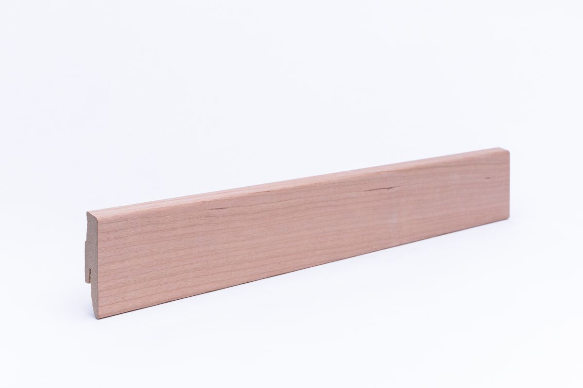 Die Sockelleiste ist mit Echtholz in Kirschbaum furniert. Dadurch erhält die sie eine natürliche Kirschbaum Optik und Holzstruktur, sowie eine kratzfeste Oberfläche. Zudem sind unsere Leisten leichter und flexibler als Furnier-Sockelleisten mit Holzkern und passen sich, auch bei leichten Unebenheiten, an Wand und Boden sehr gut an