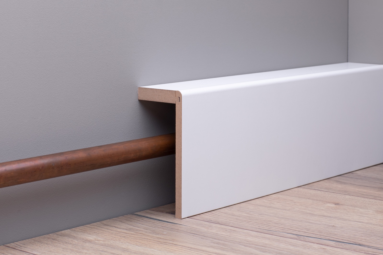 Die Rohrabdeckung / Heizungsrohrverkleidungsleiste hat einen MDF-Kern (MDF - mitteldichte Holzfaserplatte). Dieser gibt der Leiste ausreichend Stabilität.