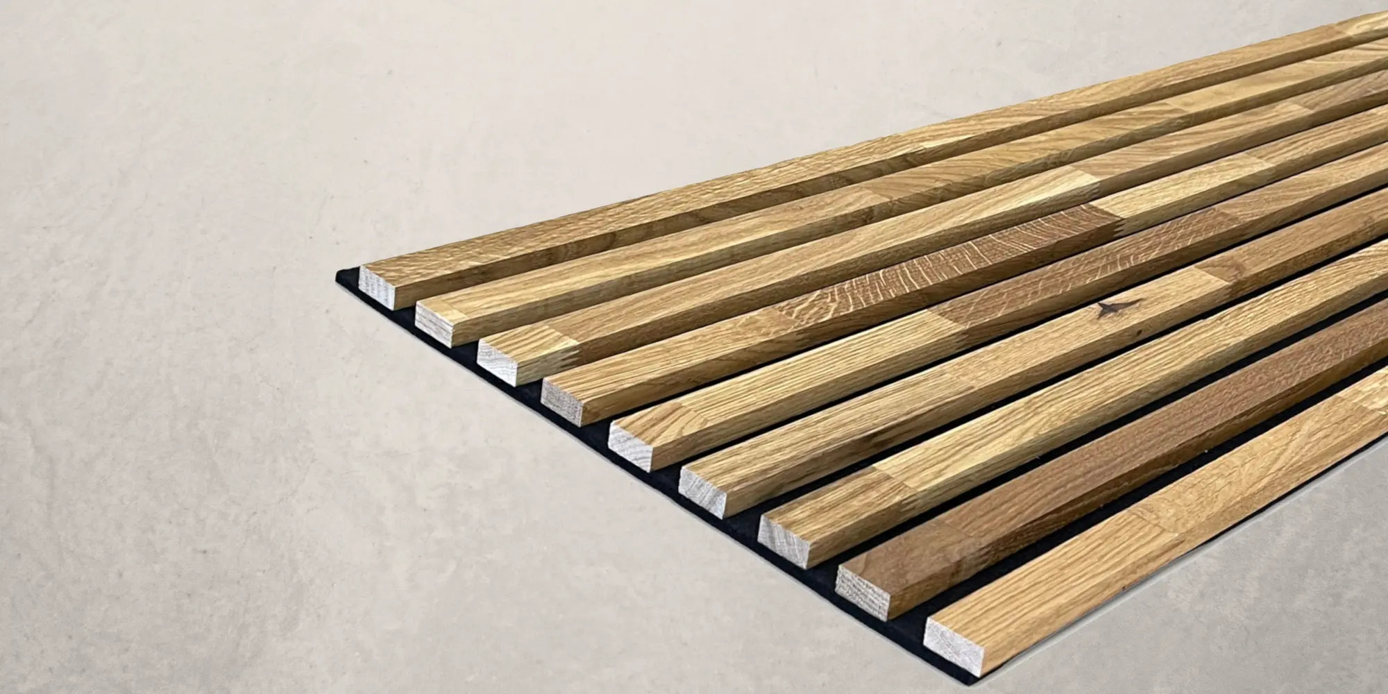 Lamellenverkleidung - Wandverkleidung - Massivholz Akustikpaneel 2400 x 600 mm Eiche natur geölt - Akustikfilz Schwarz Verbessern Sie die Akustik Ihres Raumes und bekommen sie den WOW-Effekt Unsere universell einsetzbare Wand- und Deckenverkleidung ist eine Schwarze Matte aus Filz, auf dem Eiche Massivholzlamellen angebracht sind. Durch die keilgezinkten Eiche Massivholzlamellen entsteht ein natürliches und eine einzigartiges Oberflächenbild. Egal ob horizontal, vertikal oder diagonal, Sie werden von der außergewöhnlichen Optik begeistert sein. Sogar an der Decke können Sie die Lamellenverkleidung anbringen. Zusätzlich zur großartigen Optik können Sie durch die Filzmatte auch den Schall in Ihrem Raum verringern. Die Paneele erhalten Sie in einem Stück, sodass Sie diese sofort montieren können. Bei der Montage sind Ihrer Kreativität keine Grenzen gesetzt. Oberflächenbehandlung: Unsere Eiche Massivholzlamellen werden mit einem natürlichen Holzöl behandelt. Ein schützendes und tiefwirkendes Imprägnieröl auf Basis von Naturölen. Es verleiht dem Holz ein farbvertiefendes Aussehen und die Maserung tritt wunderschön hervor. Daten im Überblick: Massivholzpaneele - Lamellenwand als Wand- und Deckenverkleidung Maße: 2400 mm x 600 mm x 20 mm Filzmatte in Schwarz 8 mm stark Lamellen aus keilgezinkten Eiche Massivholzlamellen Oberfläche Eiche geölt Maße der Lamellen 27 mm breit und 12 mm stark Abstände zwischen den Lamellen 18 mm Wandpaneele komplett vormontiert Die Montage Die Lamellenverkleidung ist sehr schnell und einfach zu montieren. Entweder sie Kleben oder Schrauben die Lamellenverkleidung an die Wand. Beim Kleben geben sie einfach den Kleber auf die Rückseite der Wandpaneele und platzieren diese dann an die gewünschte Stelle. Alternativ können sie die Akustikpaneele auch an der Wand verschrauben. Für die Decke empfehlen wir Kleben und Schrauben in Kombination. Warum Akustikpaneele von Leiste24? Massivholz Akustikpaneele aus Eiche Natur von Leiste24 bieten eine perfekte Kombination aus natürlicher Ästhetik, hervorragender Akustik und nachhaltiger Qualität. Hier sind die wichtigsten Gründe, warum Sie sich für unsere Massivholz-Paneele entscheiden sollten: Hochwertige Verarbeitung: Unsere Paneele bestehen aus massiven Eichenholzlamellen, die durch ihre robuste und natürliche Beschaffenheit überzeugen. Sie bieten sie eine unvergleichliche Langlebigkeit und eine edle, authentische Optik, die den Charme echten Holzes widerspiegelt. Exklusives Design mit natürlicher Ästhetik: Jede Oberfläche wird sorgfältig behandelt, um die natürliche Schönheit der Eiche zu betonen. Dank verschiedener Oberflächenbehandlungen sowie der Möglichkeit, die Paneele mit Farbölen oder Naturölen zu veredeln, entsteht ein luxuriöses und einladendes Ambiente, das zeitlos und elegant ist. Große Auswahl an Farben und Oberflächen: Unsere Massivholz-Akustikpaneele bieten eine breite Palette an Farboptionen, die durch verschiedene Behandlungen und Ölungen erzielt werden. Ob Sie einen helleren, natürlichen Eichen-Look bevorzugen oder eine dunklere, warme Farbvariante - die Vielfalt ermöglicht es Ihnen, die perfekte Lösung für Ihre Einrichtung zu finden. Optimale Schallabsorption: Die Akustikpaneele aus Eichenholz bieten nicht nur eine edle Optik, sondern auch eine ausgezeichnete Schallabsorption. Sie sorgen für eine angenehme und ruhige Atmosphäre, egal ob im Büro, Wohnzimmer oder Konferenzraum. Lärm wird effektiv reduziert, sodass eine bessere Akustik für Gespräche und Entspannung entsteht. Nachhaltige Materialien: Unsere Paneele bestehen nicht nur aus hochwertigem Eichenholz, sondern integrieren auch umweltfreundliche Materialien wie Filz aus zertifizierten und nachhaltigen Kunststofffasern mit einem recycelten Anteil. Diese Kombination macht unsere Akustikpaneele zur idealen Wahl für umweltbewusste Projekte und nachhaltige Raumgestaltungen. Massive Qualität zu einem fairen Preis: Bei Leiste24 müssen Sie keine Kompromisse eingehen. Unsere Massivholz-Akustikpaneele aus Eiche überzeugen durch herausragende Qualität, natürliche Materialien und eine Verarbeitung, die im Marktvergleich unschlagbar ist - und das zu einem Preis, der sich lohnt. Mit unseren Massivholz Akustikpaneelen Eiche Natur schaffen Sie eine harmonische Verbindung aus Design, Funktionalität und Nachhaltigkeit. Erleben Sie die natürliche Schönheit und die beruhigende Wirkung von echtem Holz, kombiniert mit nachhaltigen Materialien, die Ihre Räume nicht nur optisch aufwerten, sondern auch akustisch optimieren. Entscheiden Sie sich für Leiste24 und verwandeln Sie Ihre Räume in ein stilvolles, ruhiges und umweltbewusstes Ambiente!