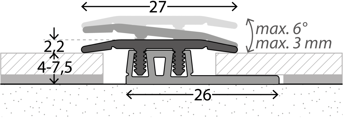 The Profi-Design clip profile system was specially developed for floating design floor coverings. The toothed profile bars of the upper profile snap securely into the trapezoidal mounts of the base profile. This allows the top profile to tilt slightly and adjust variably in height and inclination to the floor covering.The narrow, flat profiles have a particularly attractive appearance and also offer generous expansion joints for dimensional fluctuations in the floor covering. If required, the top profiles can be detached and then re-anchored in the base profile.