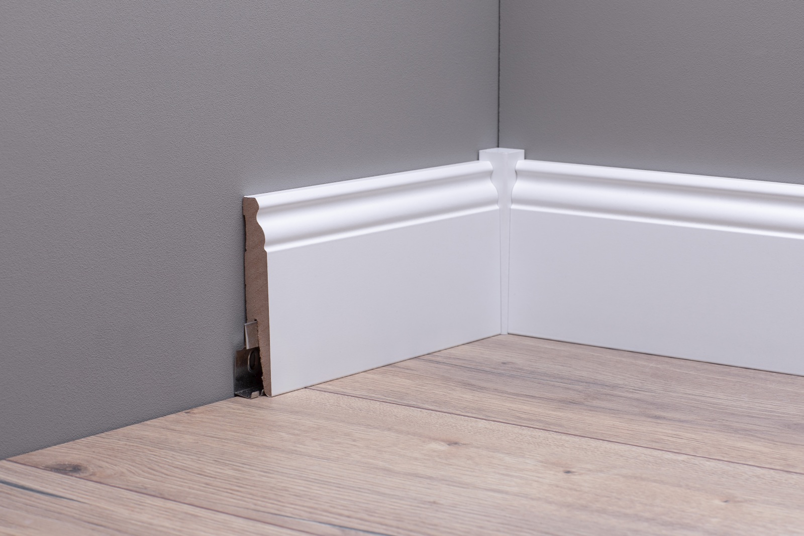 Unsere weiße Sockelleiste mit edlem Berliner Profil, auch als Hamburger Profil bekannt, verschönert durch ihren klassischen und zeitlosen Stil jeden Raum.