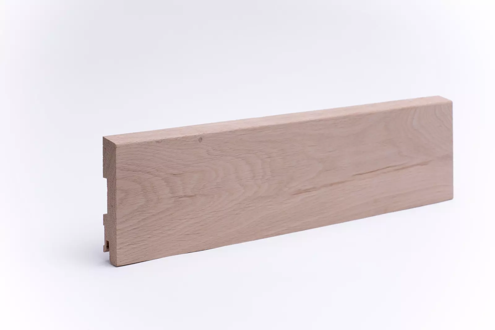 Skirting board made of genuine untreated oak wood with chamfered front edge in the dimensions 100mm x 20mm x 2400mm. The profiles are produced from one piece of wood from the trunk and give rise to a harmonious finish in wood and colour structure.