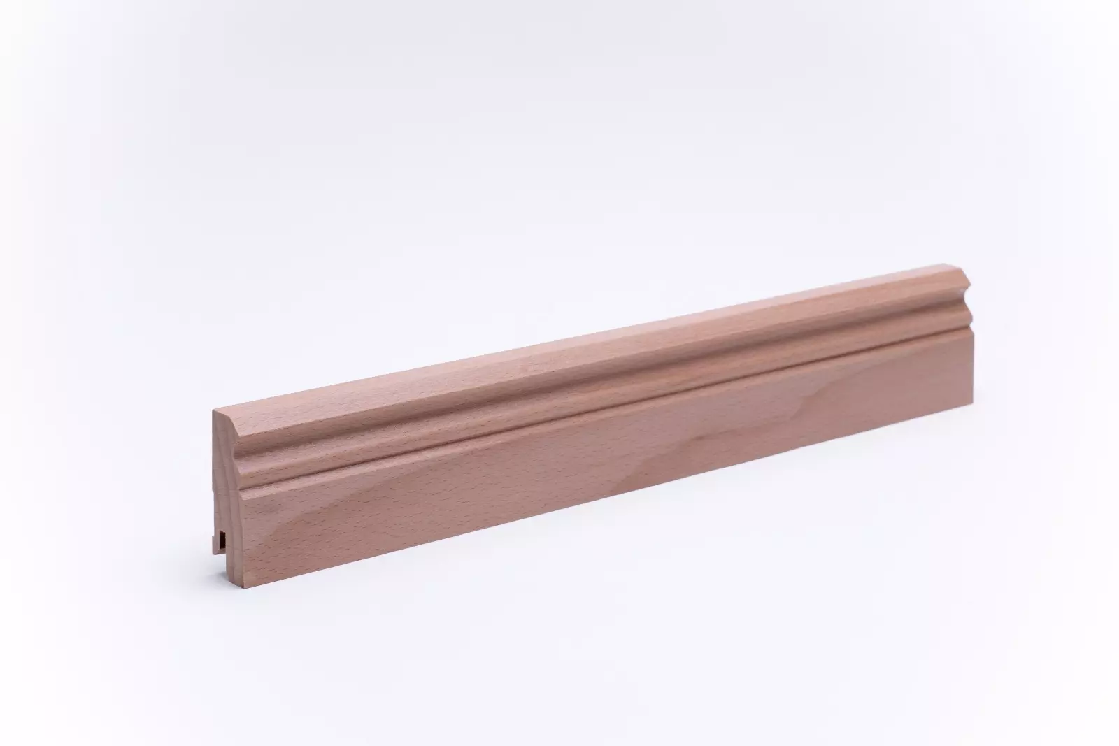 Skirting board made of genuine varnished beech wood with Berlin profile in the dimensions 60mm x 20mm x 2400mm. The profiles are produced from one piece of wood from the trunk and give rise to a harmonious finish in wood and colour structure.