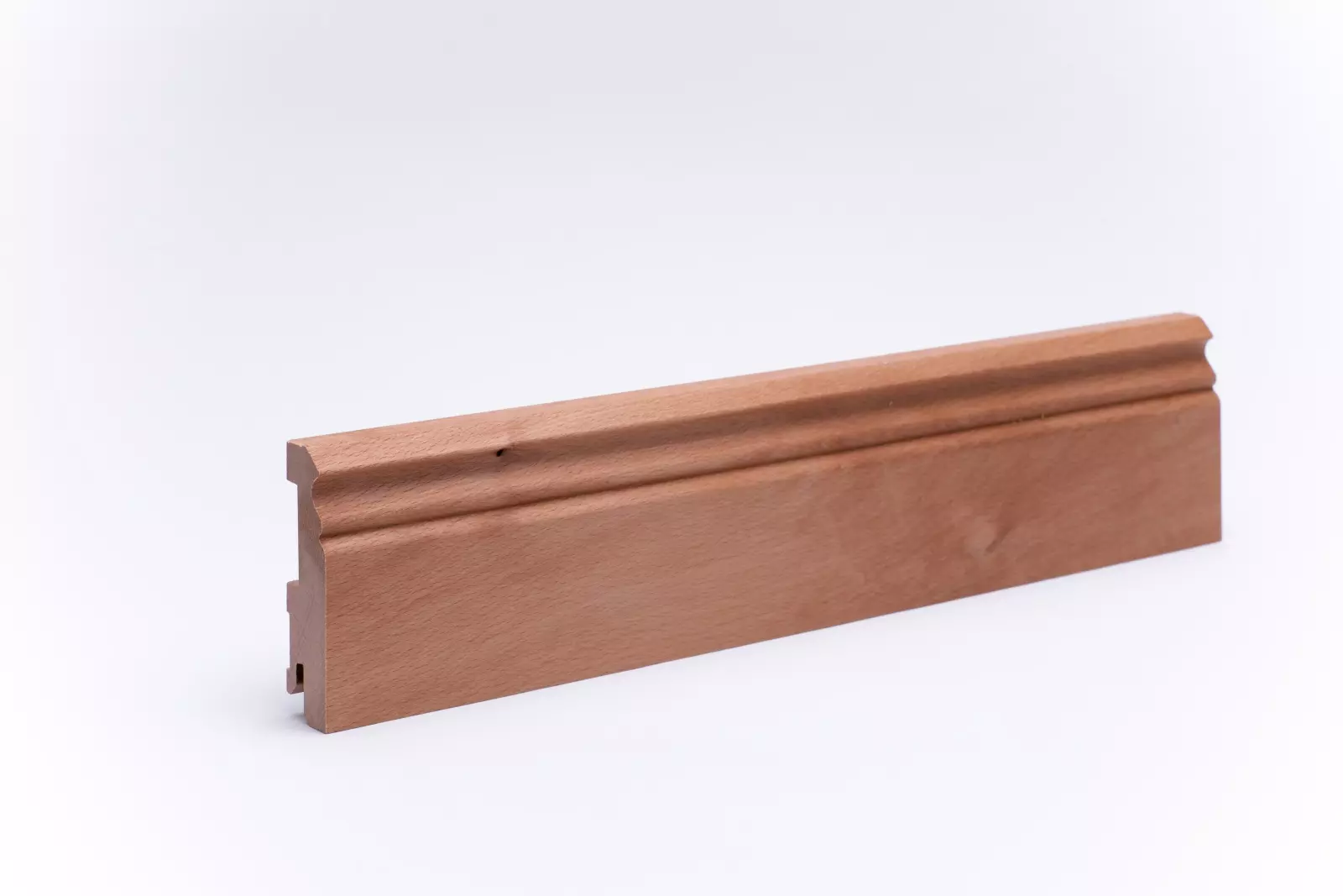 Skirting board made of genuine oiled beech wood with Berlin profile in the dimensions 80mm x 20mm x 2400mm. The profiles are produced from one piece of wood from the trunk and give rise to a harmonious finish in wood and colour structure.