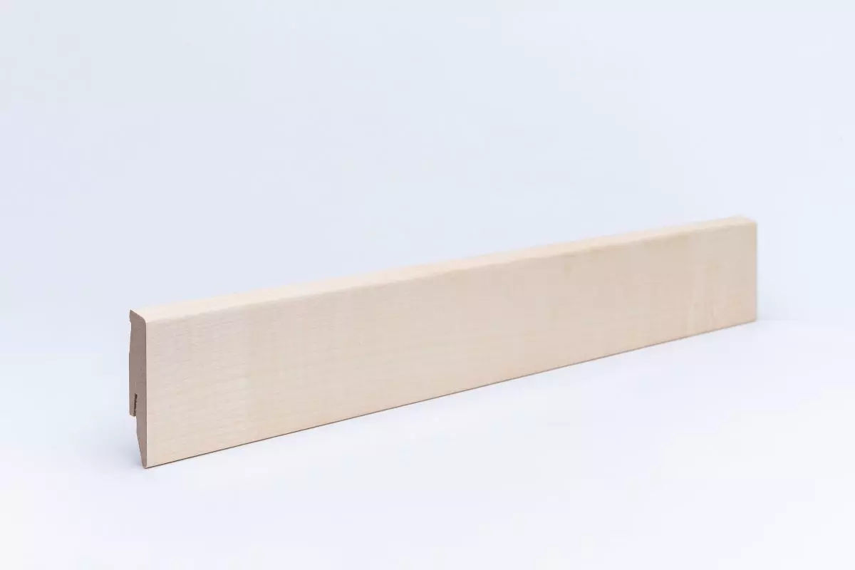 The skirting board is veneered with real wood in maple . The treatment with wood oil makes the surface appear warmer and the natural structure of the maple wood comes into its own. The oil is drawn into the pores of the wood, making it more resistant to dust, dirt and moisture .